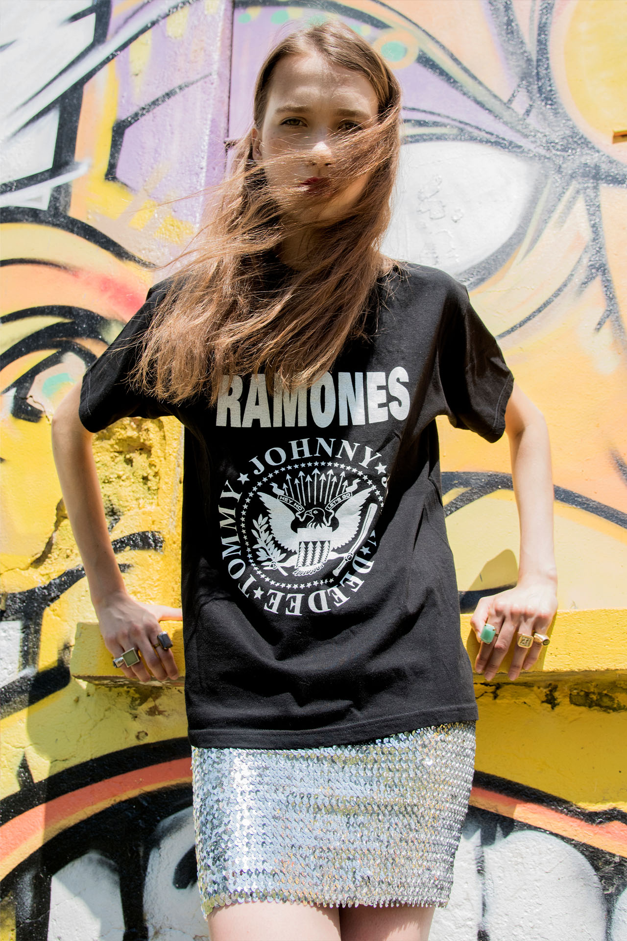 Ramones tee, sequins, graffiti. High-low rebellion captured against concrete.